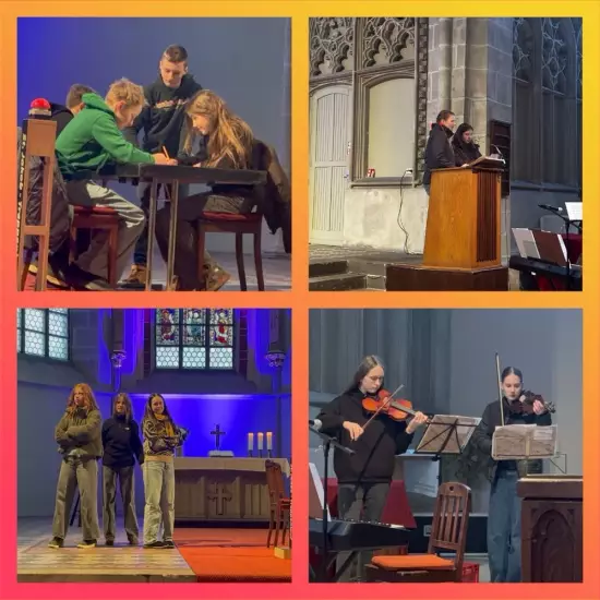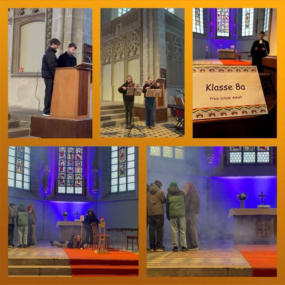 Für die traditionelle Andacht zu den Halbjahreszeugnissen fühlte sich in diesem Schuljahr die Klasse 8a zuständig und bereitete im Religionsunterricht das Thema für die Schulgemeinschaft auf, das eng mit der Jahreslosung der evangelischen Kirche "Gott spricht: Siehe, ich mach alles neu." verbunden ist. Auch die Ansprache der Schulleiterin Heike Makk und die Begrüßung durch Pfarrer Martin Olejnicki zeigten das deutlich. Allen Schülerinnen und Schülern, aber auch Lehrkäften und Eltern, die die Zusammenkunft in der St. Jakob Köthen besuchten, wurde Mut gemacht, nach vorn zu schauen, Hilfe anzunehmen und sich und anderen Menschen vor allem beim Lernen Entwicklung zuzugestehen. Der Schulchor und die Instrumentalgruppe der FSA unter der Leitung von Musiklehrer David Lein zeigten wieder einmal ihre Freude an der Musik und konnten diese auf alle übertragen. Nun freuen sich alle Schülerinnen, Schüler und Lehrkräfte auf die Winterferien.